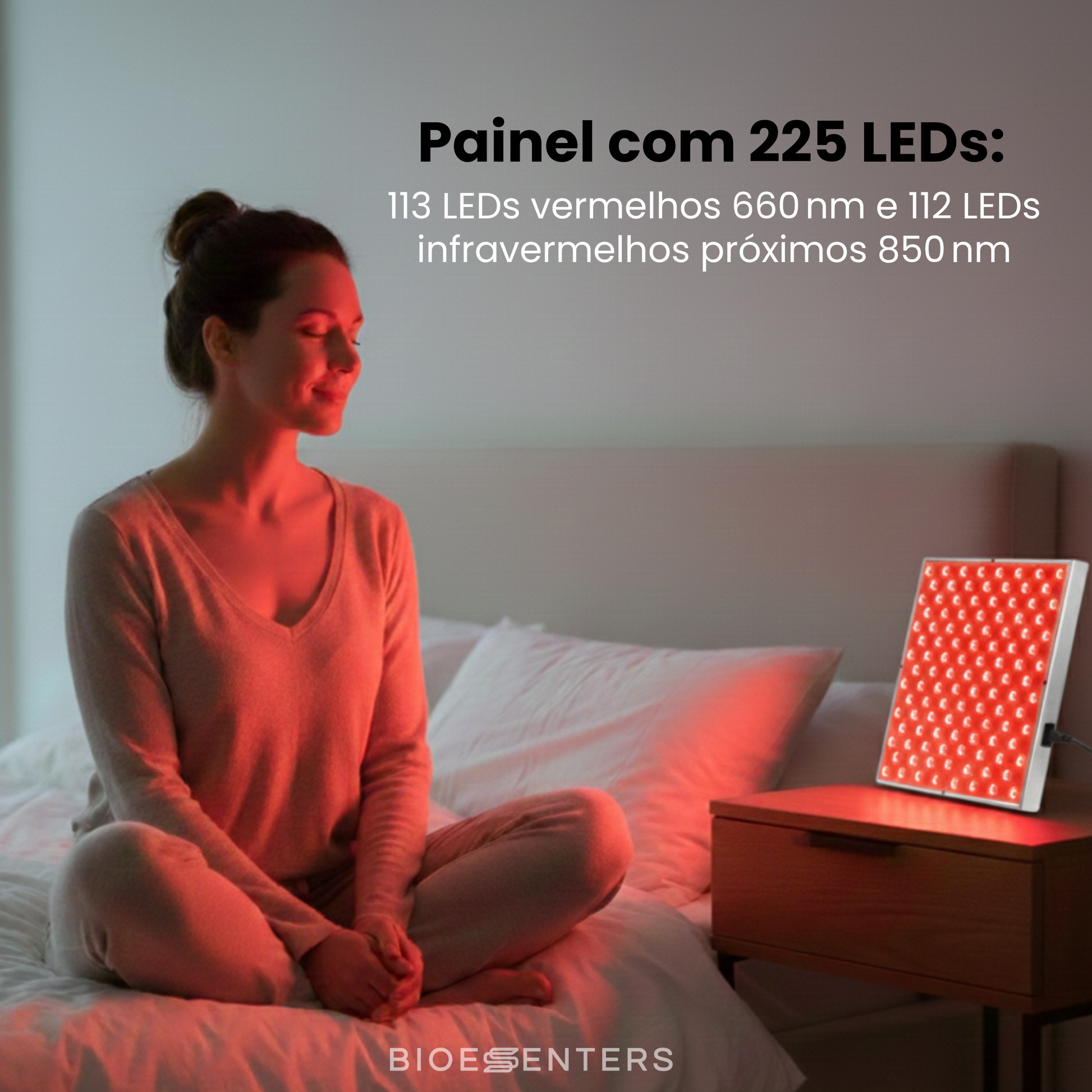 A combinação de luz vermelha (660 nm) e luz infravermelha próxima (850 nm) atua nas suas células e no ritmo circadiano, ajudando o corpo a entrar mais facilmente em modo descanso.