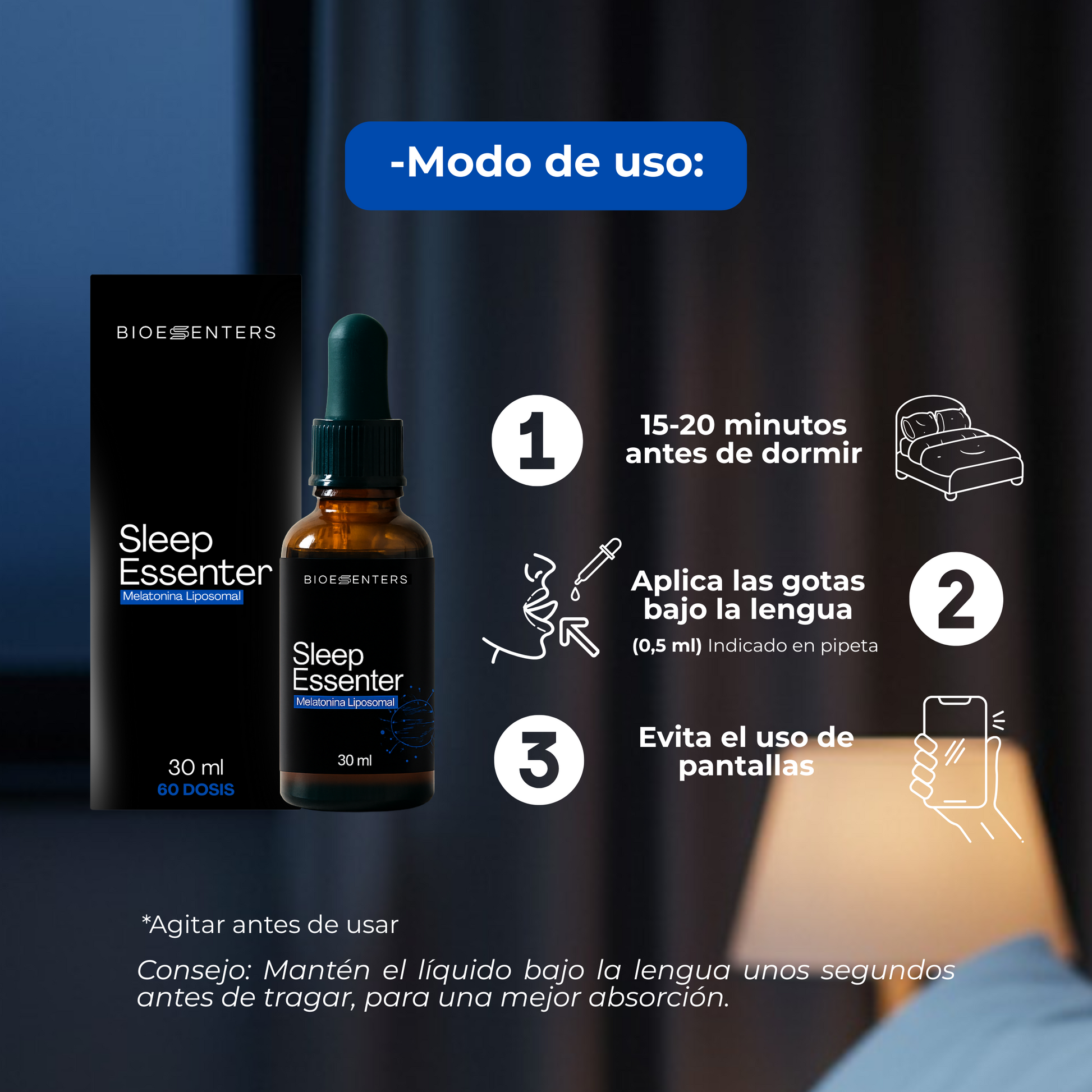 Modo de empleo: 1 toma diaria de 1 mg (0,5 ml) antes de dormir. Usa la pipeta y llena hasta la marca.
